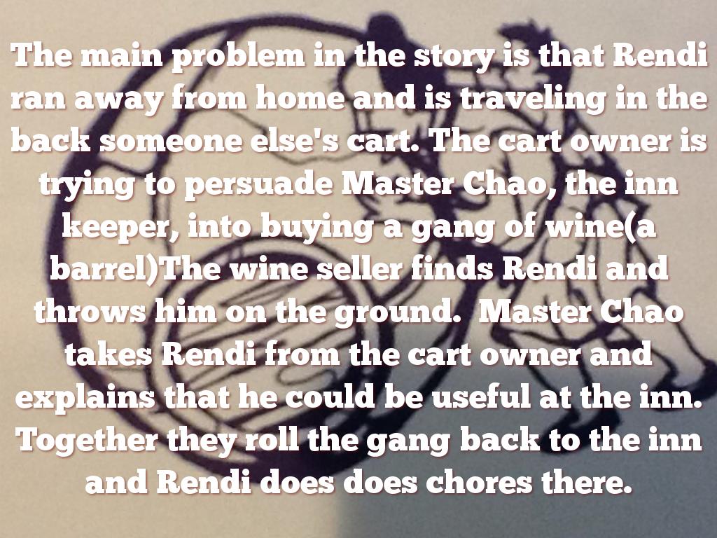 The main problem in the story is that Rendi ran away from home and is traveling in the back someone else's cart. The cart owner is trying to persuade Master Chao, the inn keeper, into buying a gang of wine(a barrel)The wine seller finds Rendi and throws him on the ground. Master Chao takes Rendi from the cart owner and explains that he could be useful at the inn. Together they roll the gang back to the inn and Rendi does does chores there.