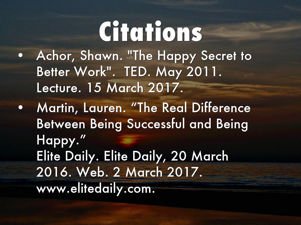 Achor, Shawn. "The Happy Secret to Better Work". TED. May 2011. Lecture. 15 March 2017.