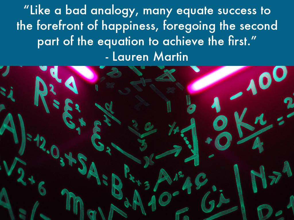 “Like a bad analogy, many equate success to the forefront of happiness, foregoing the second part of the equation to achieve the first.” - Lauren Martin