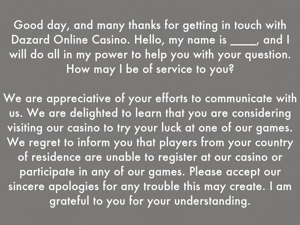 Good day, and many thanks for getting in touch with Dazard Online Casino. Hello, my name is ____, and I will do all in my power to help you with your question. How may I be of service to you?