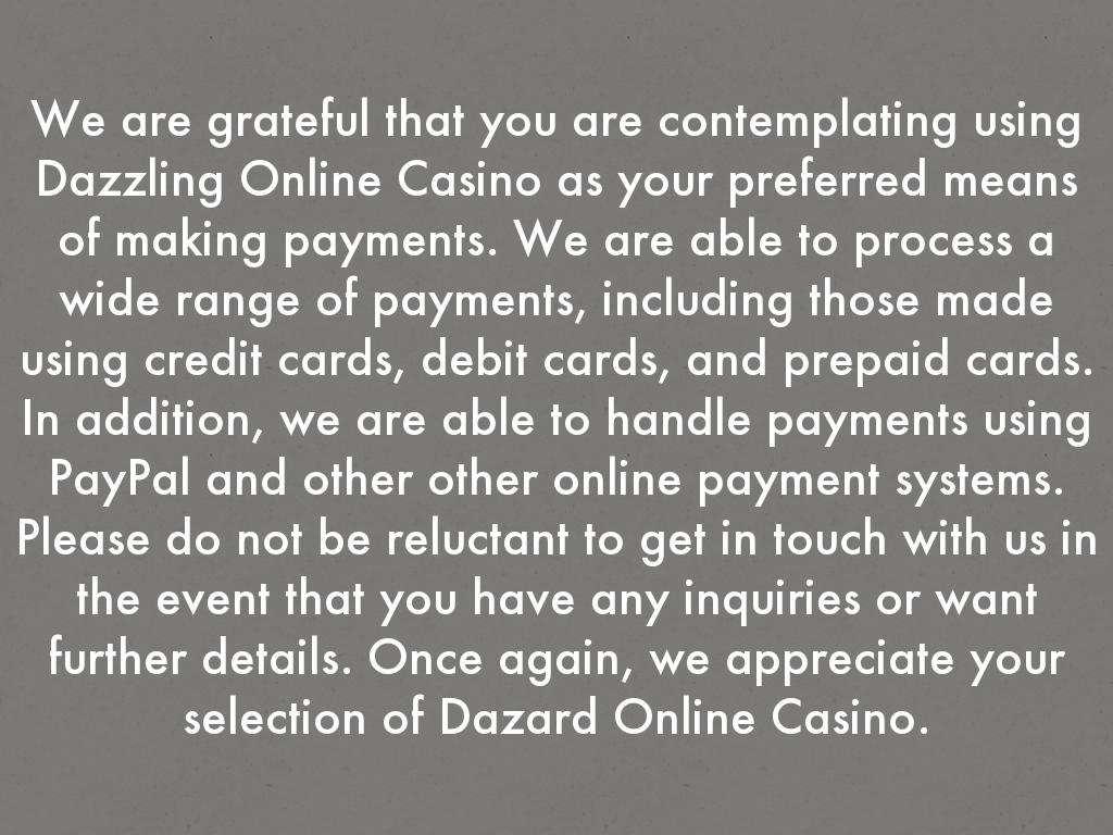 We are grateful that you are contemplating using Dazzling Online Casino as your preferred means of making payments. We are able to process a wide range of payments, including those made using credit cards, debit cards, and prepaid cards. In addition, we are able to handle payments using PayPal and other other online payment systems. Please do not be reluctant to get in touch with us in the event that you have any inquiries or want further details. Once again, we appreciate your selection of Dazard Online Casino.