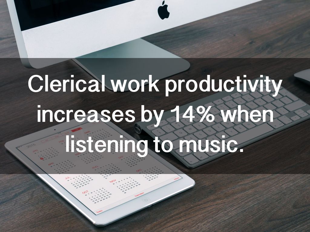Clerical work productivity increases by 14% when listening to music.