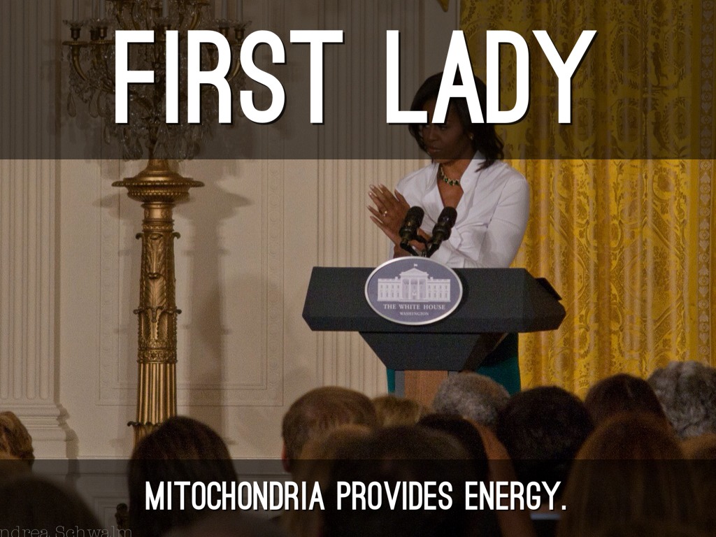 The First Lady is like the cell organelle mitochondria, because the mitochondria provides most of the energy cells need to carry out its functions. The First Lady does that by helping everybody in the house and by giving them advice.
