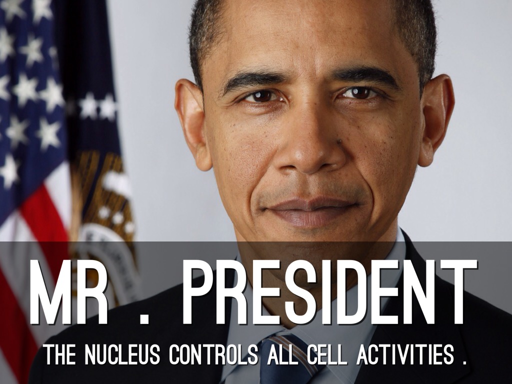 The president is like the nucleus, because like I said the nucleus controls all cell activities. Which in this case Mr. President is controlling the state and all the of the people.