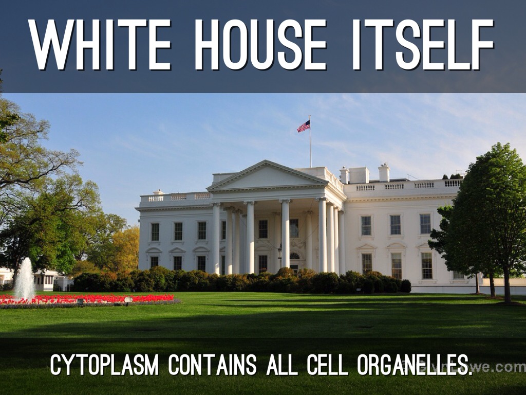 The cytoplasm is like the White House because, the cytoplasm contains all of the cell organelles. So in a way the White House is the cell itself, has the rest of the organelles inside.