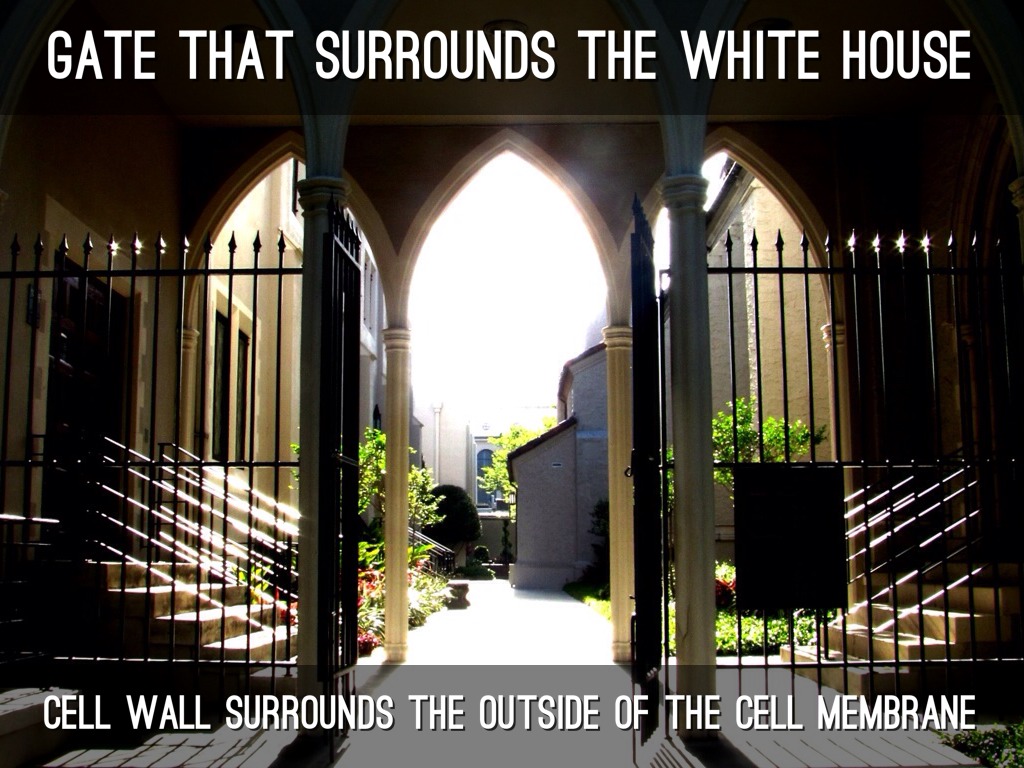 A cell is kind of like a second cell membrane. The cell protects and controls things that comes in and out of the cell or the White House. So the gate surrounds the White House for protection.