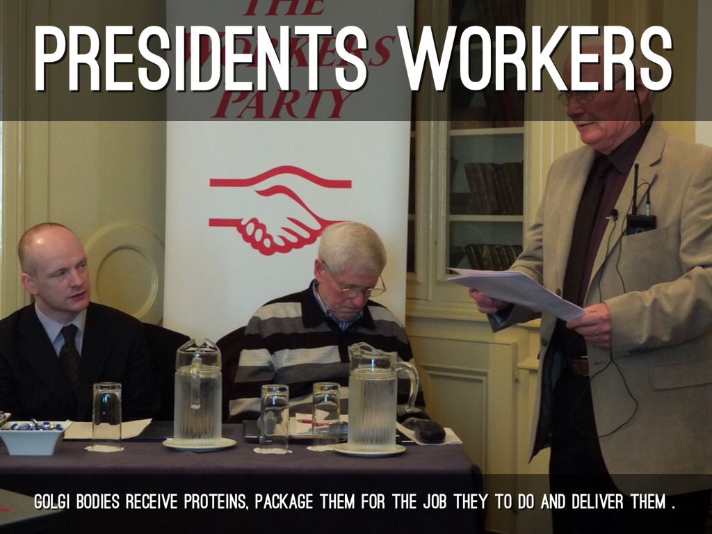 The Golgi Bodies are like the presidents workers, because they receive proteins for the president and his crew then they deliver them to different parts of the cell or White House.