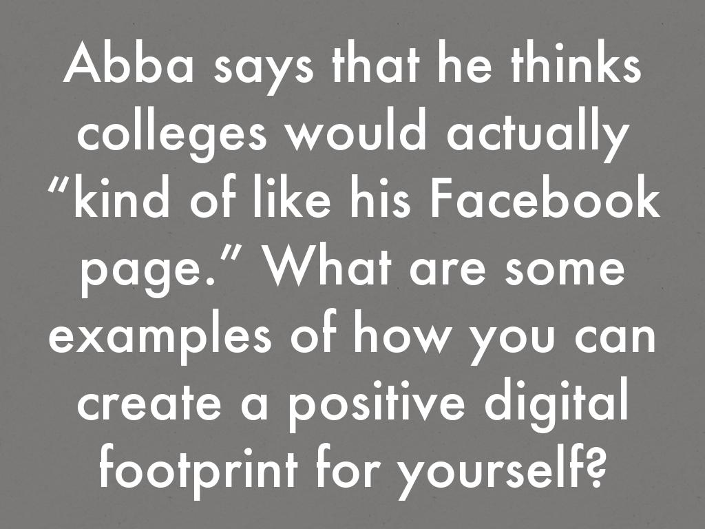 Abba says that he thinks colleges would actually “kind of like his Facebook page.” What are some examples of how you can create a positive digital footprint for yourself?
