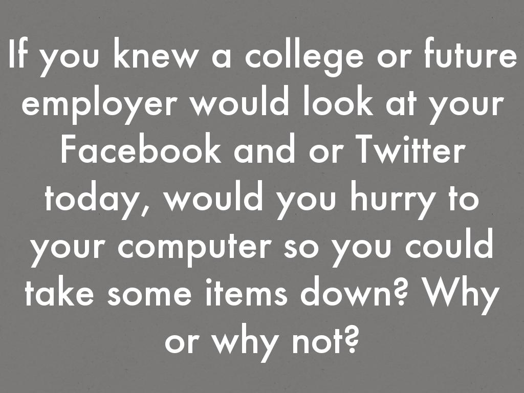 If you knew a college or future employer would look at your Facebook and or Twitter today, would you hurry to your computer so you could take some items down? Why or why not?