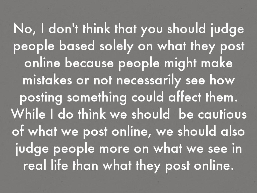 No, I don't think that you should judge people based solely on what they post online because people might make mistakes or not necessarily see how posting something could affect them. While I do think we should be cautious of what we post online, we should also judge people more on what we see in real life than what they post online.