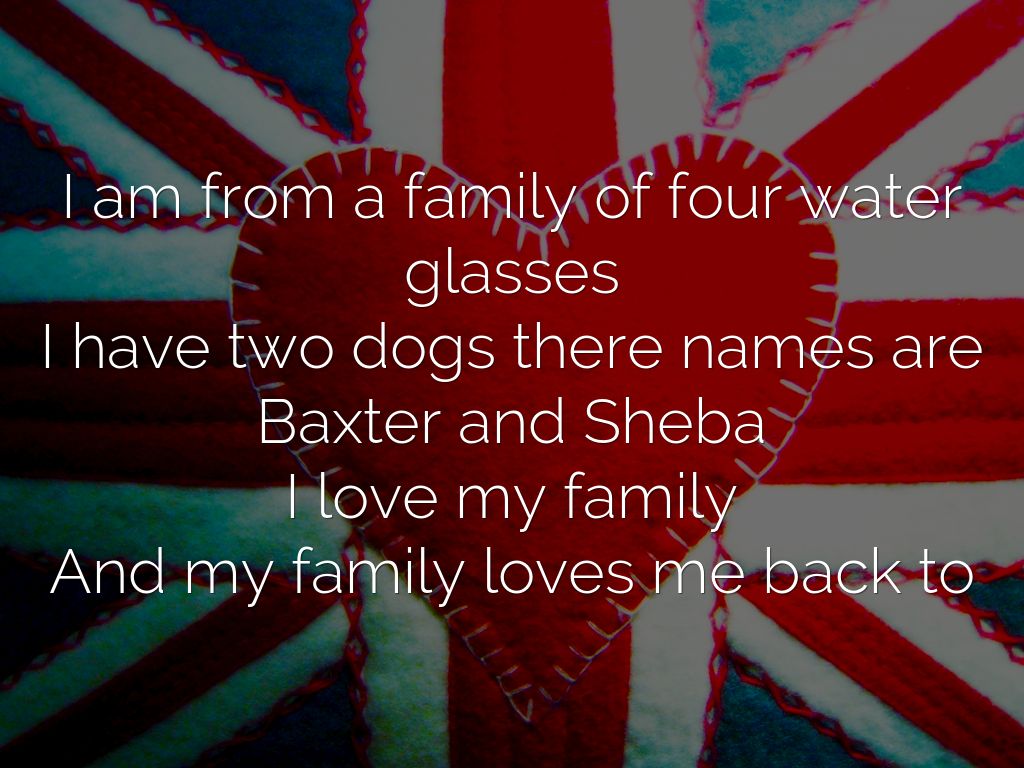 I am caring to my family My family loves me And I also take care of my family when they are sick to like my two dogs, Baxter and Sheba And sometimes I pretend that my dogs are people I play with my dogs all the time