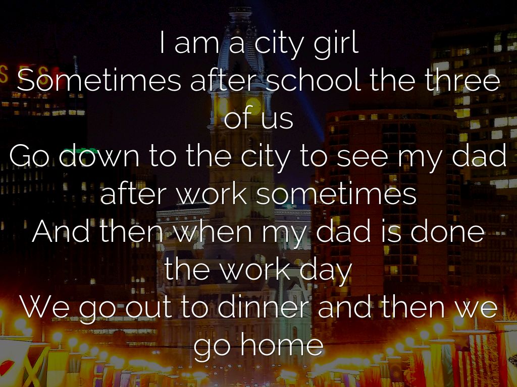 I am a city girl Sometimes after school the three of us Go down to the city to see my dad after work sometimes And then when my dad is done the work day We go out to dinner and then we go home