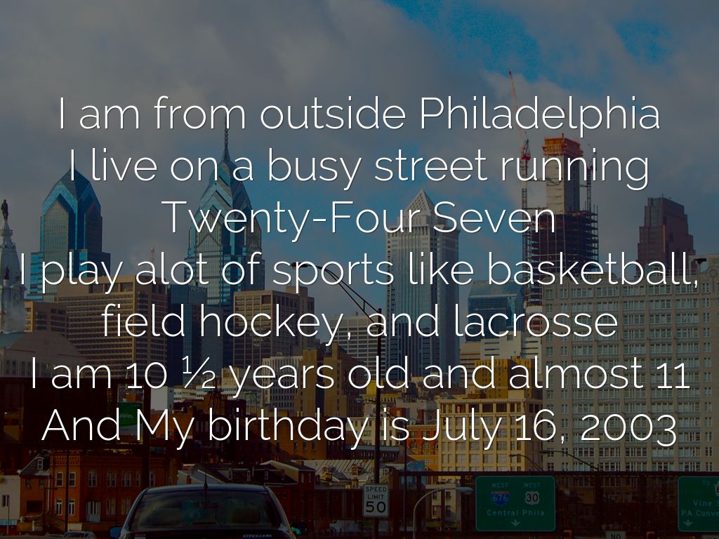 I am from outside Philadelphia I live on a busy street running Twenty-Four Seven I play alot of sports like basketball, field hockey, and lacrosse I am 10 ½ years old and almost 11 And My birthday is July 16, 2003