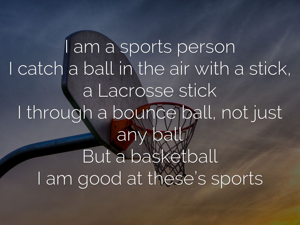 I am a sports person I catch a ball in the air with a stick, a Lacrosse stick I through a bounce ball, not just any ball But a basketball I am good at these’s sports