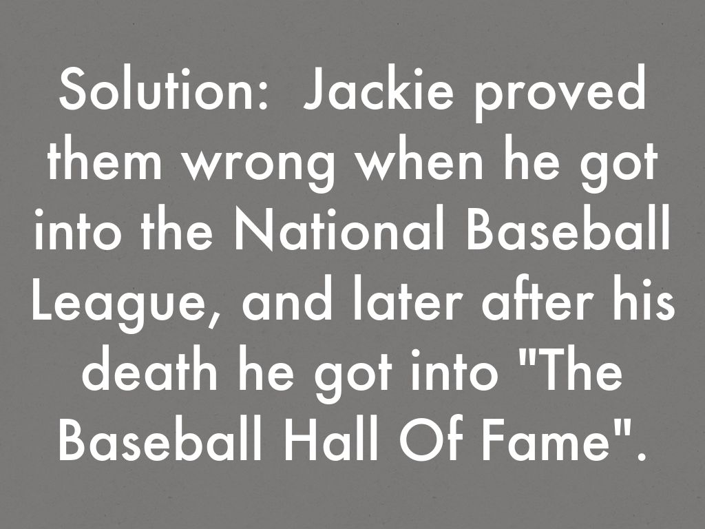 Solution: Jackie proved them wrong when he got into the National Baseball League, and later after his death he got into "The Baseball Hall Of Fame".