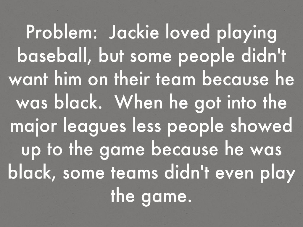 Problem: Jackie loved playing baseball, but some people didn't want him on their team because he was black. When he got into the major leagues less people showed up to the game because he was black, some teams didn't even play the game.
