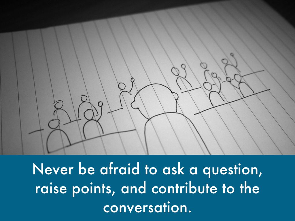 Never be afraid to ask a question, raise points, and contribute to the conversation.