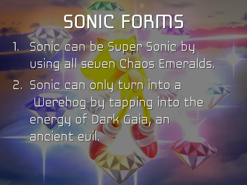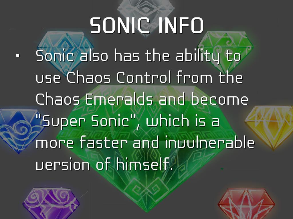 Sonic also has the ability to use Chaos Control from the Chaos Emeralds and become "Super Sonic", which is a more faster and invulnerable version of himself.