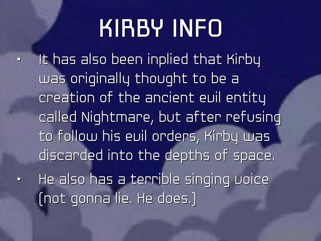 It has also been inplied that Kirby was originally thought to be a creation of the ancient evil entity called Nightmare, but after refusing to follow his evil orders, Kirby was discarded into the depths of space.