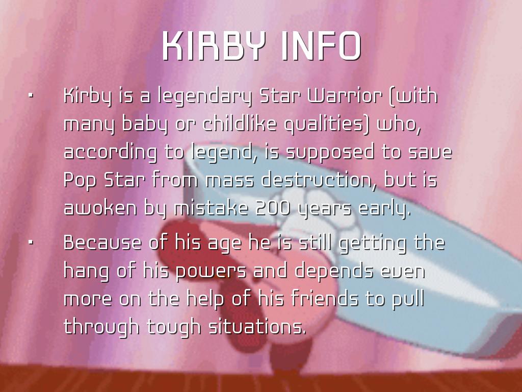 Kirby is a legendary Star Warrior (with many baby or childlike qualities) who, according to legend, is supposed to save Pop Star from mass destruction, but is awoken by mistake 200 years early.
