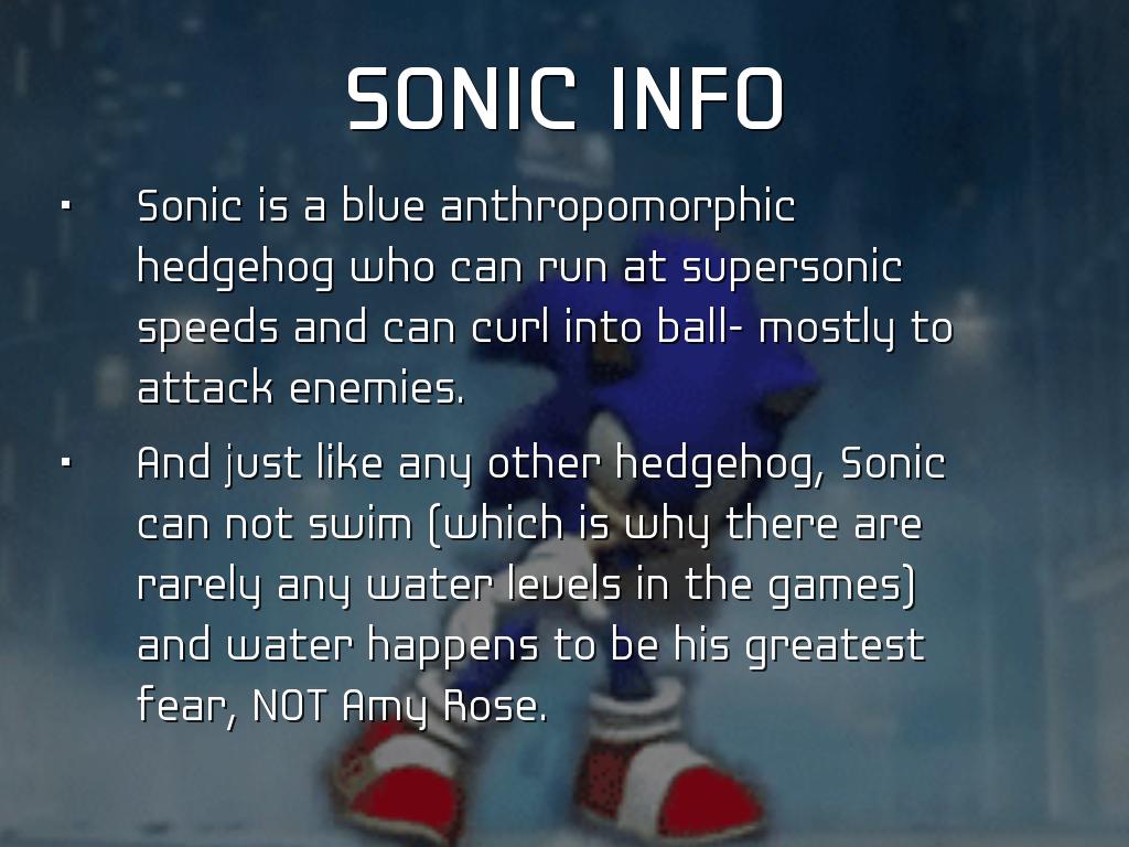 And just like any other hedgehog, Sonic can not swim (which is why there are rarely any water levels in the games) and water happens to be his greatest fear, NOT Amy Rose.