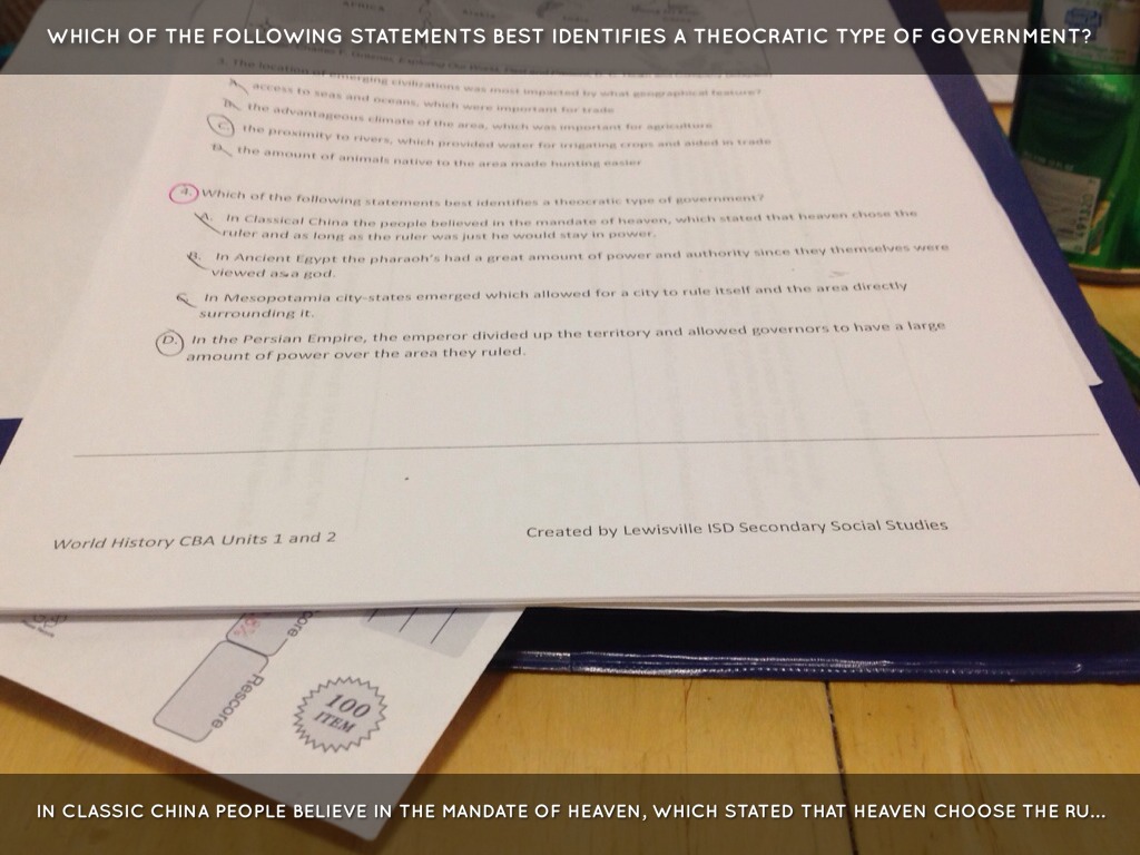 WHICH OF THE FOLLOWING STATEMENTS BEST IDENTIFIES A THEOCRATIC TYPE OF GOVERNMENT?