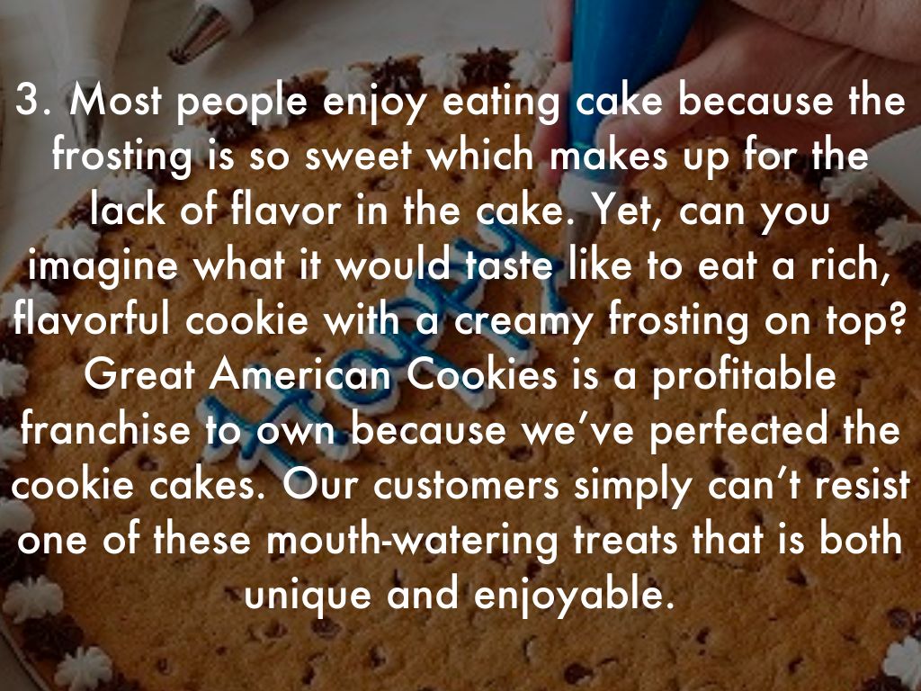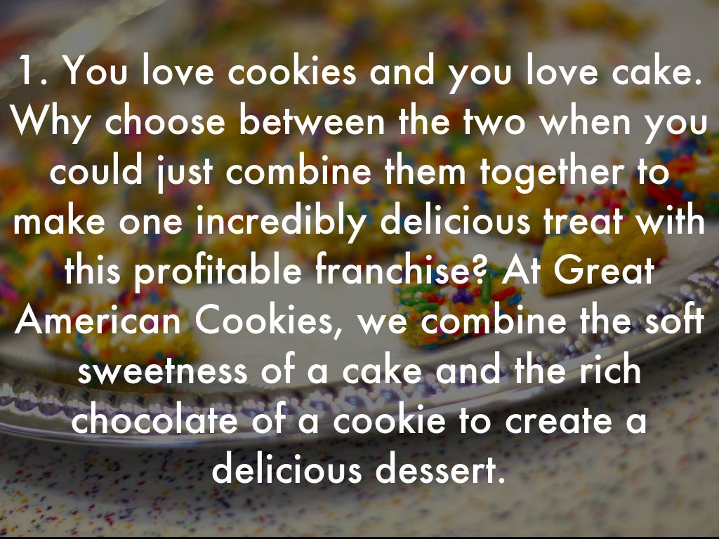 1. You love cookies and you love cake. Why choose between the two when you could just combine them together to make one incredibly delicious treat with this profitable franchise? At Great American Cookies, we combine the soft sweetness of a cake and the rich chocolate of a cookie to create a delicious dessert.
