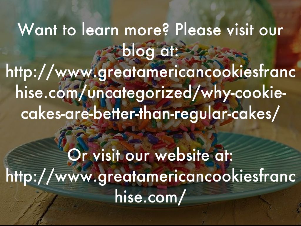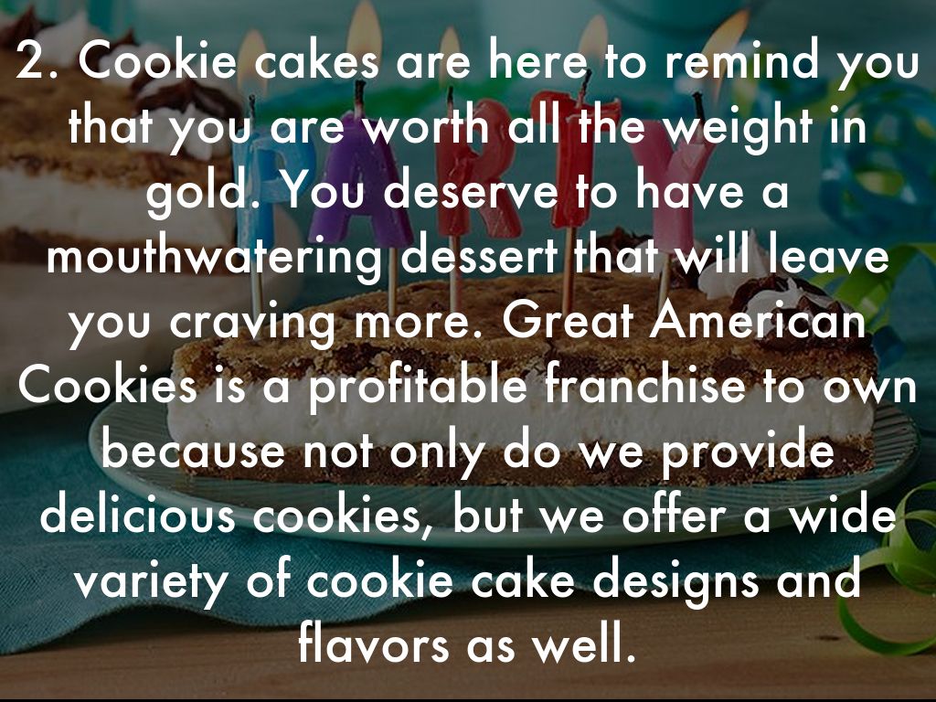 2. Cookie cakes are here to remind you that you are worth all the weight in gold. You deserve to have a mouthwatering dessert that will leave you craving more. Great American Cookies is a profitable franchise to own because not only do we provide delicious cookies, but we offer a wide variety of cookie cake designs and flavors as well.