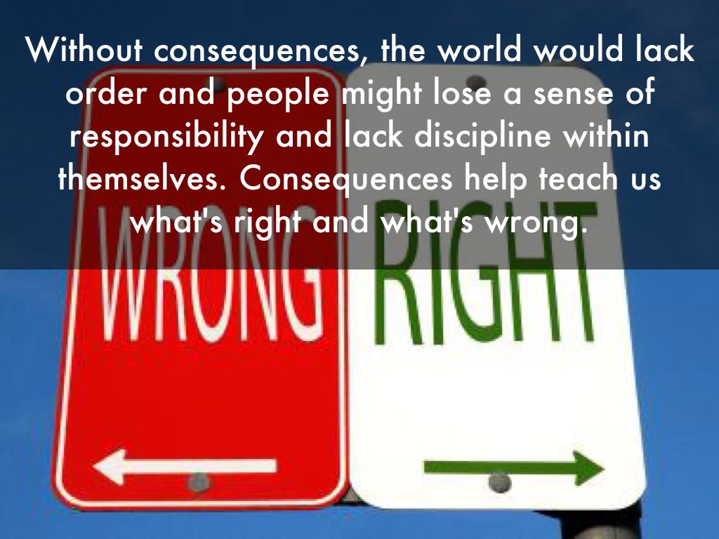 Without consequences, the world would lack order and people might lose a sense of responsibility and lack discipline within themselves. Consequences help teach us what's right and what's wrong.