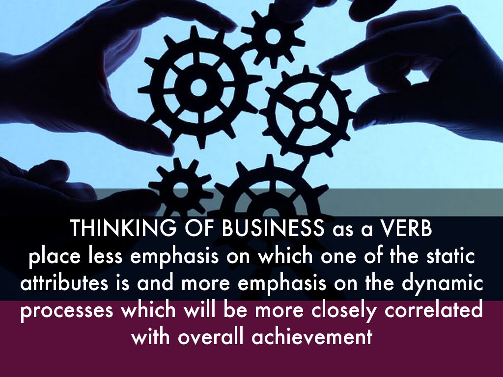 So if we could only start thinking of business less like a noun and more like a verb, we'd place less emphasis on the static attributes, of which the concept is but one, and more emphasis on the dynamic processes which will be more closely correlated with overall achievement.
