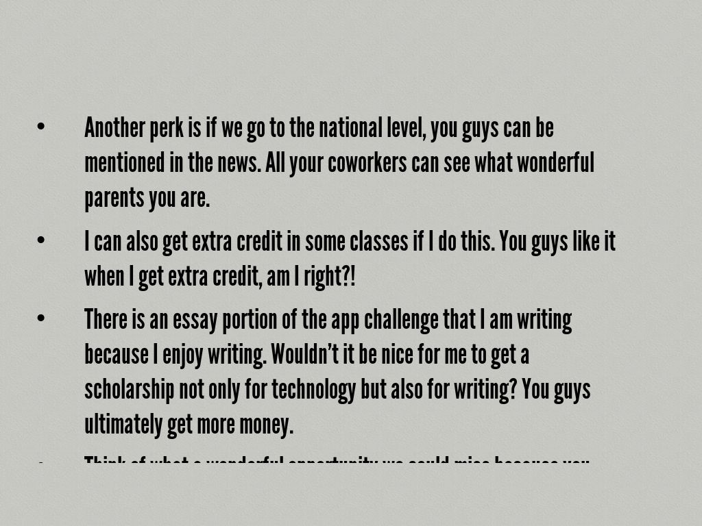 • There is an essay portion of the app challenge that I am writing because I enjoy writing. Wouldn't it be nice for me to get a scholarship not only for technology but also for writing? You guys ultimately get more money.