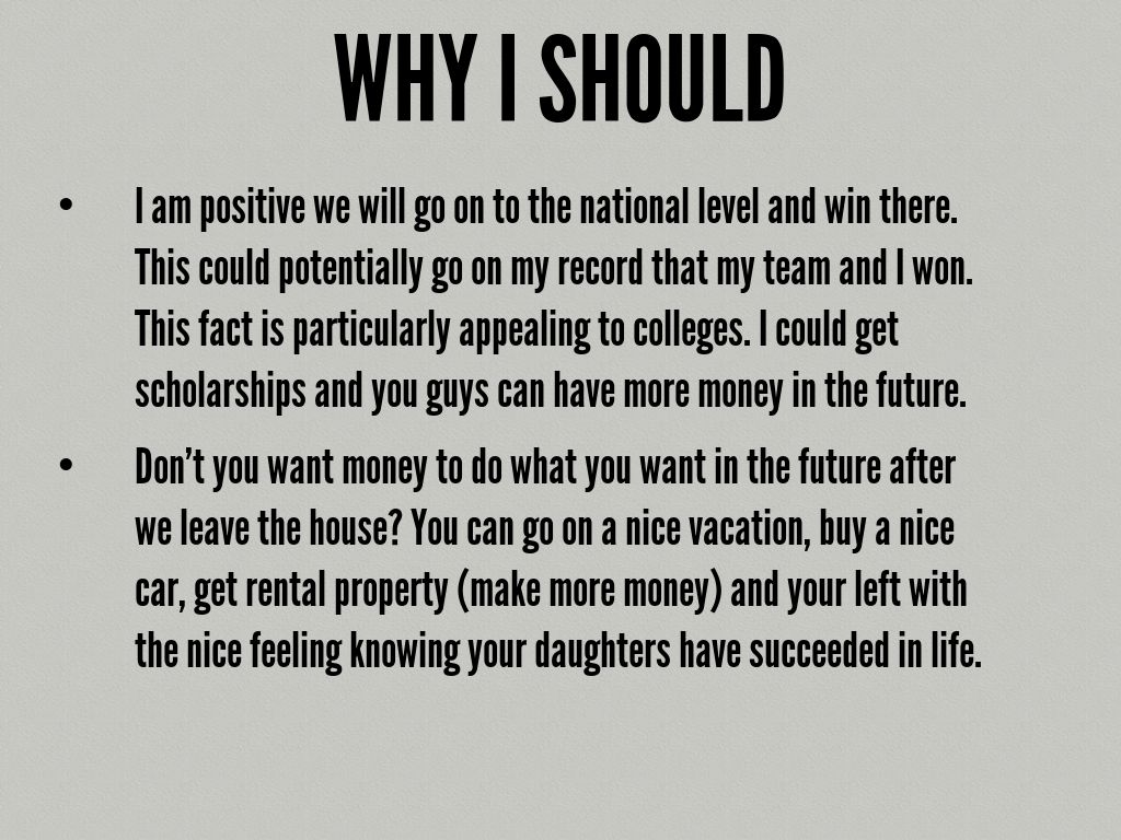 • I am positive we will go on to the national level and win there. This could potentially go on my record that my team and I won. This fact is particularly appealing to colleges. I could get scholarships and you guys can have more money in the future.