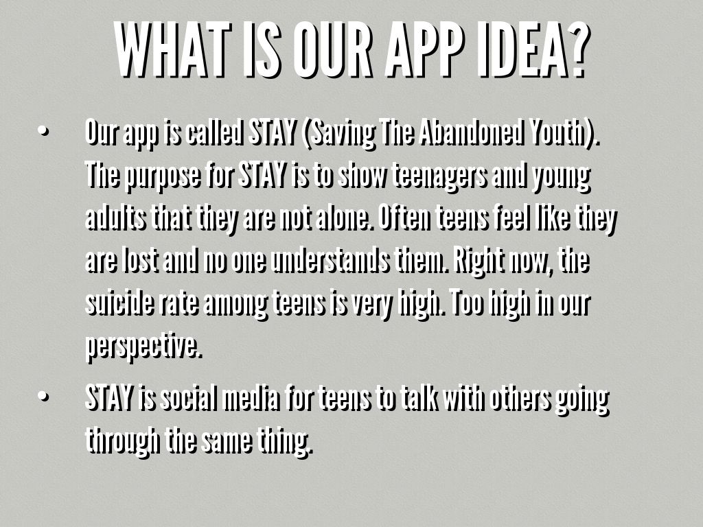 • Our app is called STAY (Saving The Abandoned Youth). The purpose for STAY is to show teenagers and young adults that they are not alone. Often teens feel like they are lost and no one understands them. Right now, the suicide rate among teens is very high. Too high in our perspective.