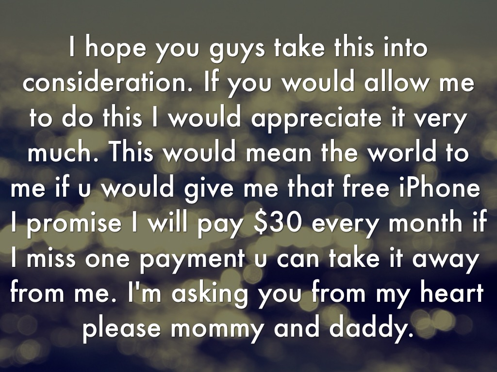 I hope you guys take this into consideration. If you would allow me to do this I would appreciate it very much. This would mean the world to me if u would give me that free iPhone I promise I will pay $30 every month if I miss one payment u can take it away from me. I'm asking you from my heart please mommy and daddy.