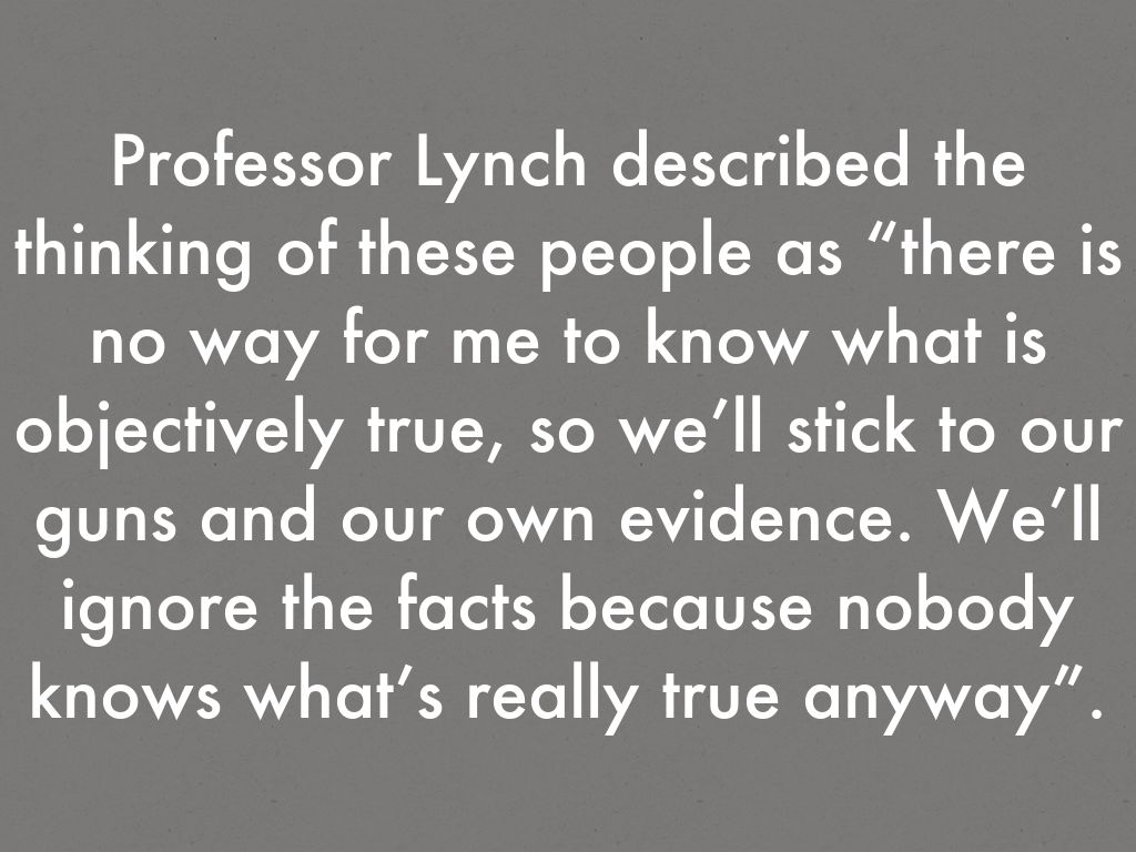 Professor Lynch described the thinking of these people as “there is no way for me to know what is objectively true, so we’ll stick to our guns and our own evidence. We’ll ignore the facts because nobody knows what’s really true anyway”.