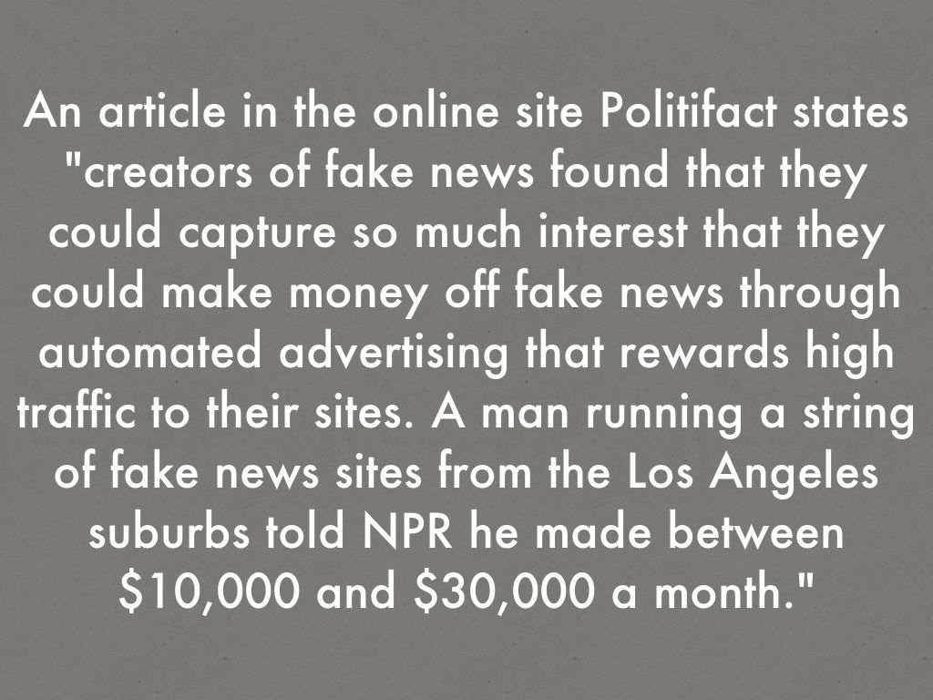 An article in the online site Politifact states "creators of fake news found that they could capture so much interest that they could make money off fake news through automated advertising that rewards high traffic to their sites. A man running a string of fake news sites from the Los Angeles suburbs told NPR he made between $10,000 and $30,000 a month."