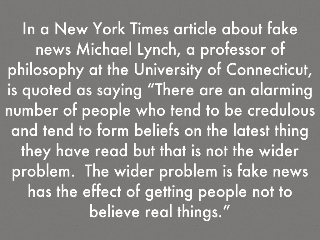 In a New York Times article about fake news Michael Lynch, a professor of philosophy at the University of Connecticut, is quoted as saying “There are an alarming number of people who tend to be credulous and tend to form beliefs on the latest thing they have read but that is not the wider problem. The wider problem is fake news has the effect of getting people not to believe real things.”