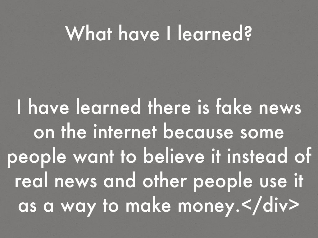 I have learned there is fake news on the internet because some people want to believe it instead of real news and other people use it as a way to make money.