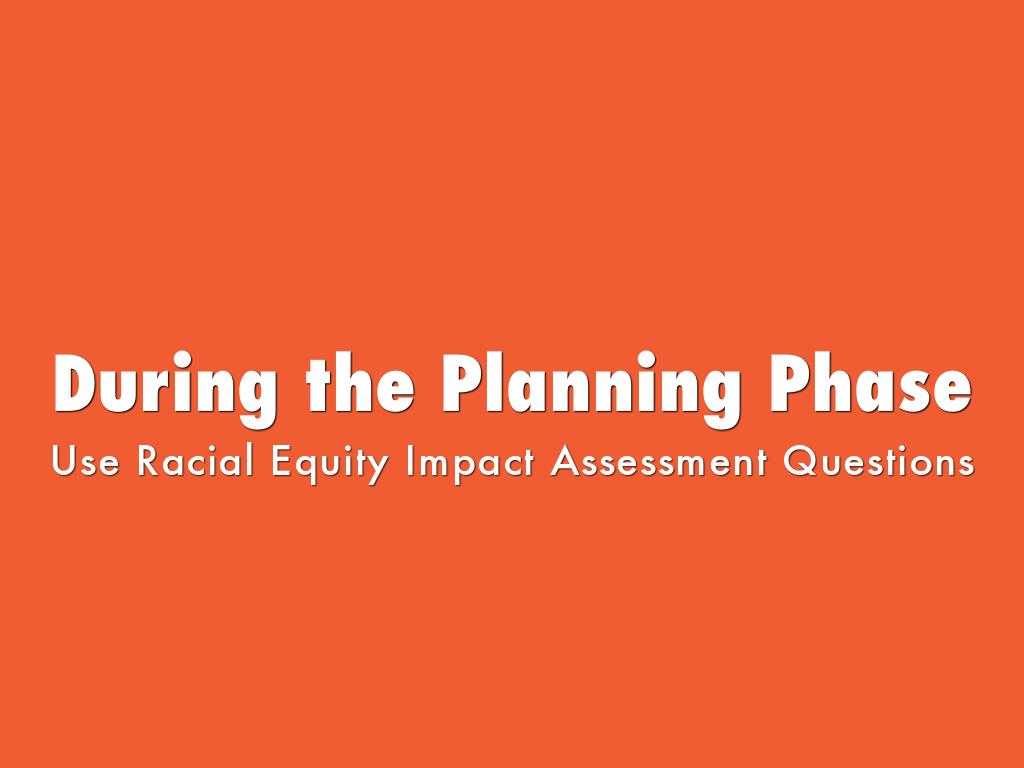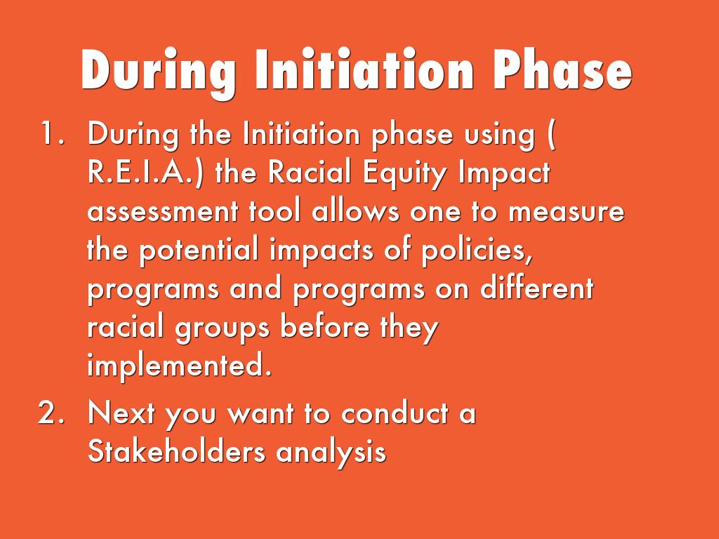 During the Initiation phase using ( R.E.I.A.) the Racial Equity Impact assessment tool allows one to measure the potential impacts of policies, programs and programs on different racial groups before they implemented.