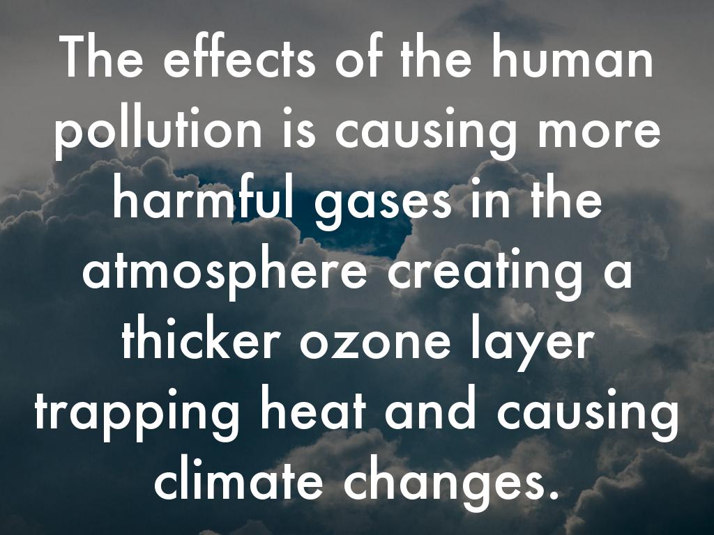 The effects of the human pollution is causing more harmful gases in the atmosphere creating a thicker ozone layer trapping heat and causing climate changes.