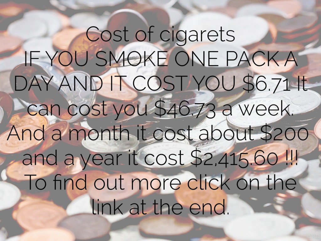 IF YOU SMOKE ONE PACK A DAY AND IT COST YOU $6.71 It can cost you $46.73 a week. And a month it cost about $200 and a year it cost $2,415.60 !!!