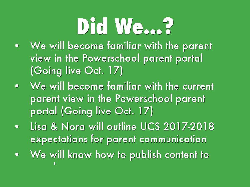 • Lisa & Nora will outline UCS 2017-2018 expectations for parent communication