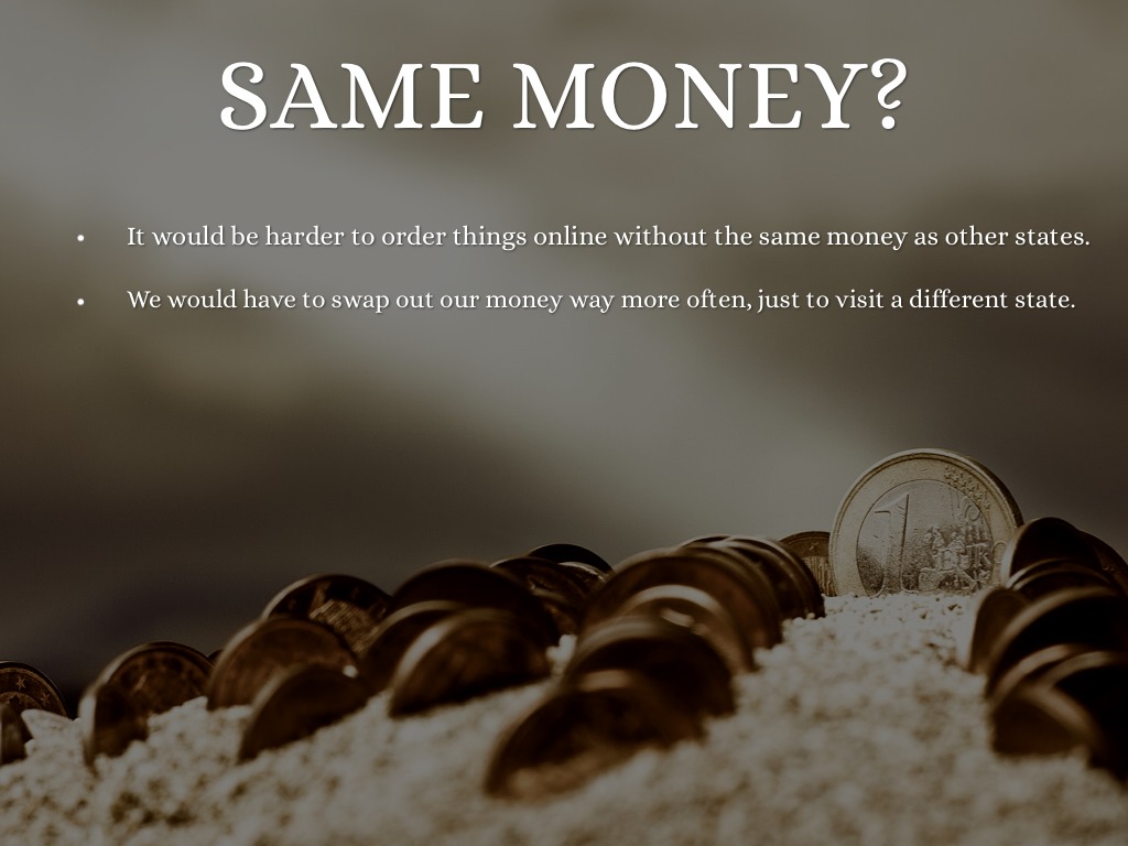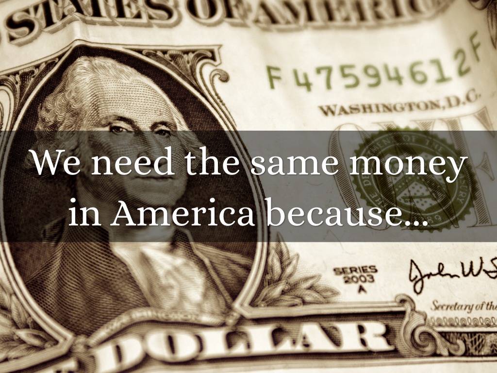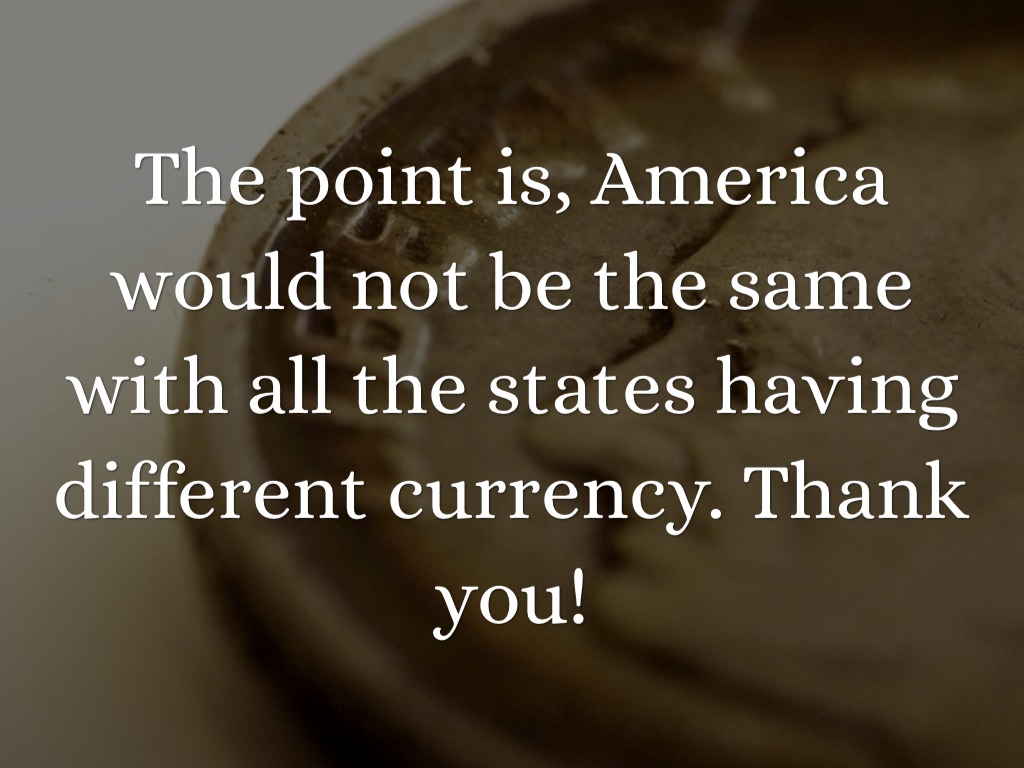 The point is, America would not be the same with all the states having different currency. Thank you!