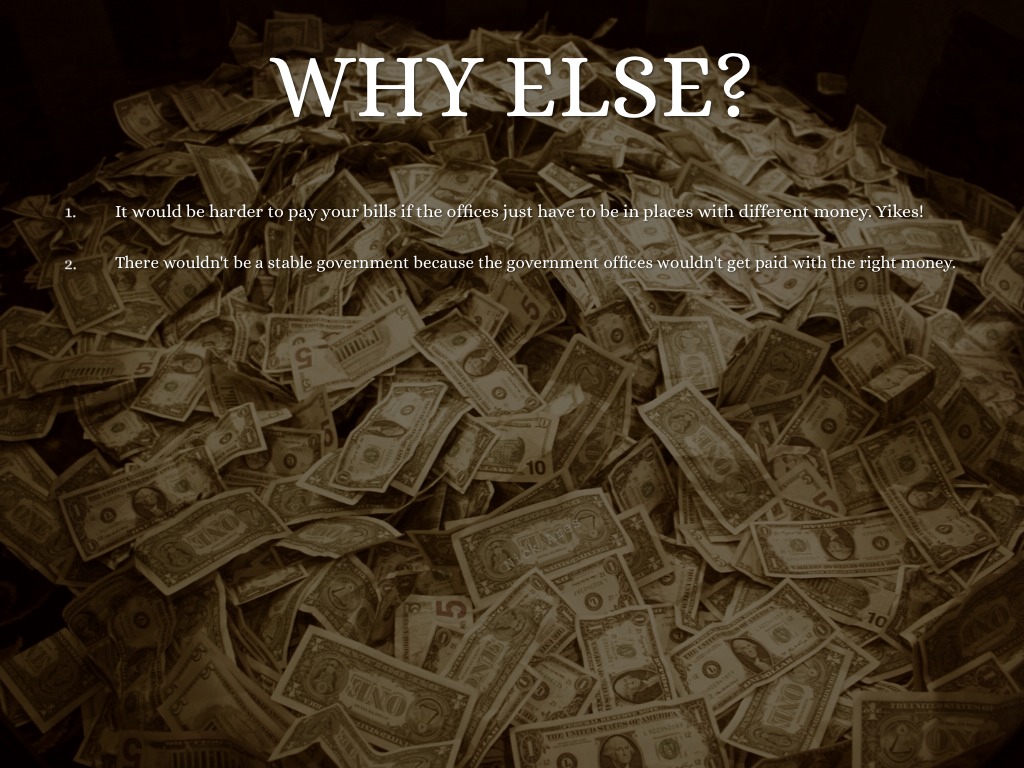 There wouldn't be a stable government because the government offices wouldn't get paid with the right money.