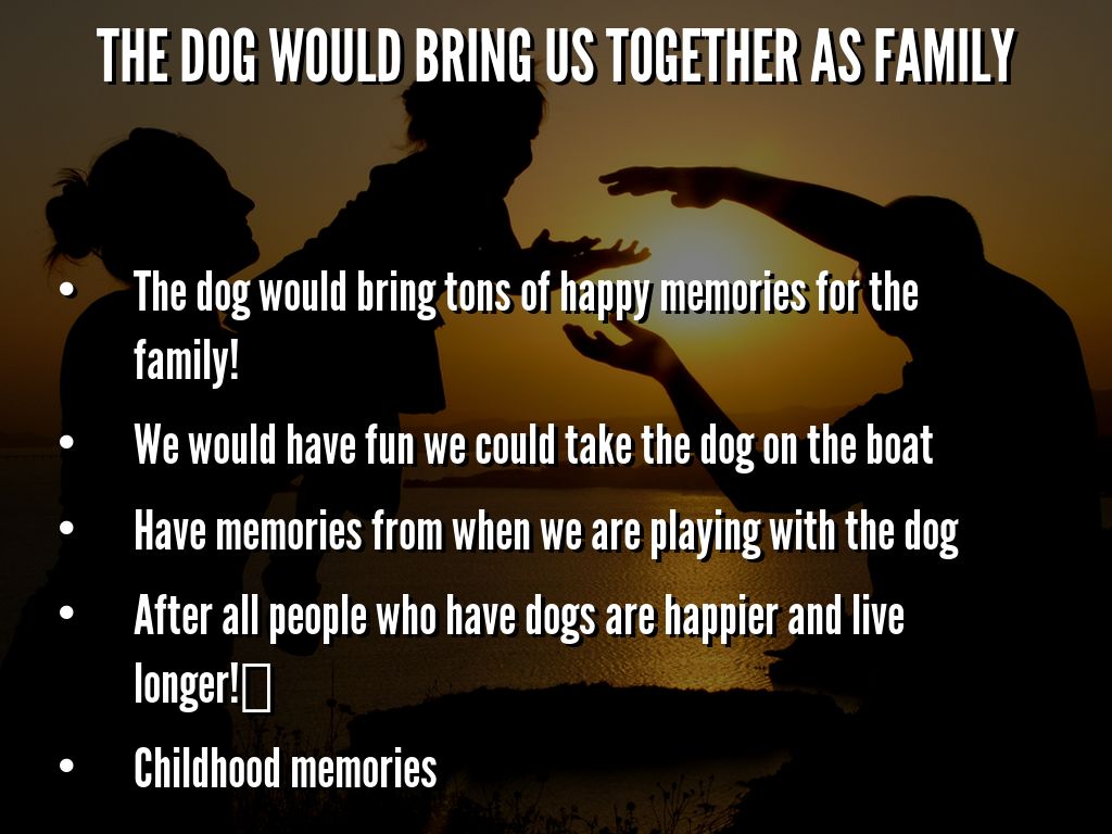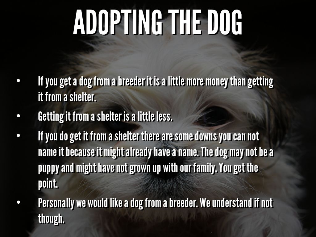 If you do get it from a shelter there are some downs you can not name it because it might already have a name. The dog may not be a puppy and might have not grown up with our family. You get the point.