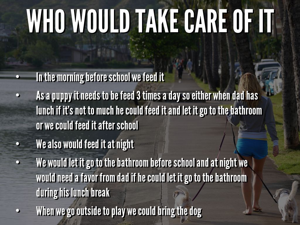 As a puppy it needs to be feed 3 times a day so either when dad has lunch if it's not to much he could feed it and let it go to the bathroom or we could feed it after school