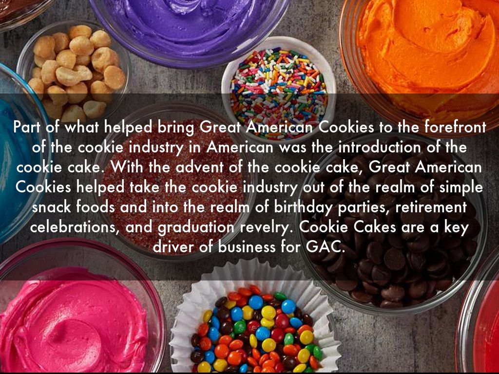 Part of what helped bring Great American Cookies to the forefront of the cookie industry in American was the introduction of the cookie cake. With the advent of the cookie cake, Great American Cookies helped take the cookie industry out of the realm of simple snack foods and into the realm of birthday parties, retirement celebrations, and graduation revelry. Cookie Cakes are a key driver of business for GAC.