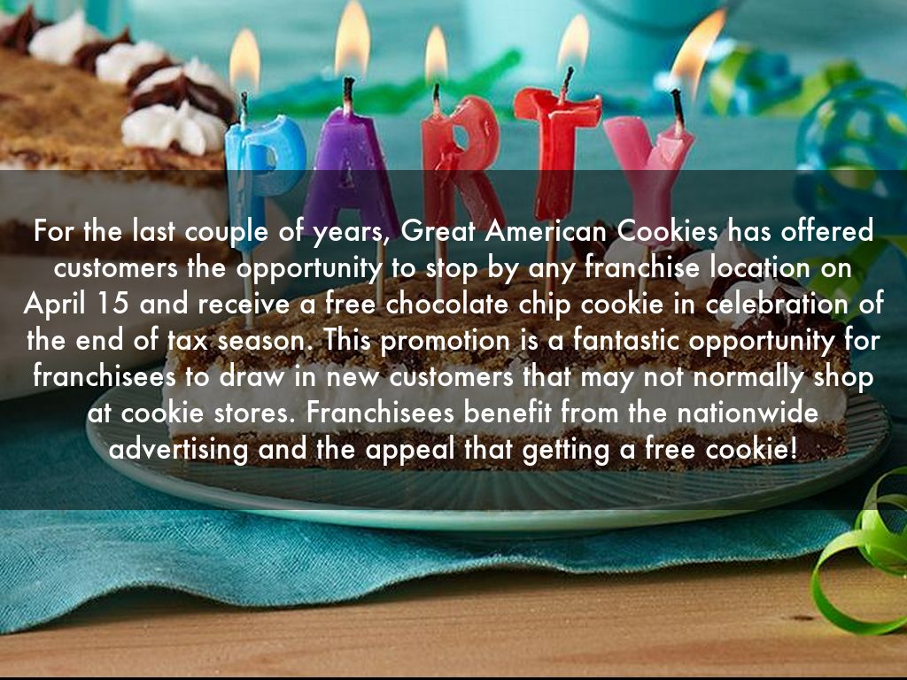 For the last couple of years, Great American Cookies has offered customers the opportunity to stop by any franchise location on April 15 and receive a free chocolate chip cookie in celebration of the end of tax season. This promotion is a fantastic opportunity for franchisees to draw in new customers that may not normally shop at cookie stores. Franchisees benefit from the nationwide advertising and the appeal that getting a free cookie!