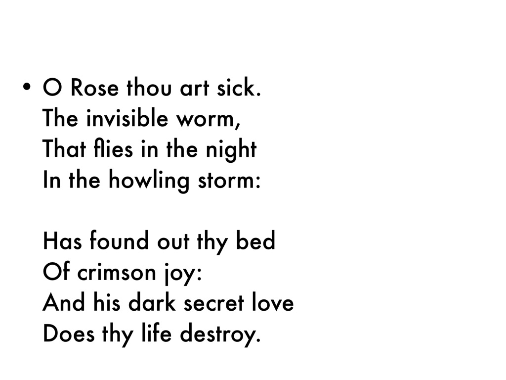 • O Rose thou art sick. The invisible worm, That flies in the night In the howling storm: Has found out thy bed Of crimson joy: And his dark secret love Does thy life destroy.