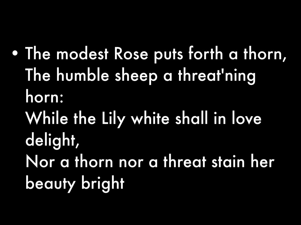 • The modest Rose puts forth a thorn, The humble sheep a threat'ning horn: While the Lily white shall in love delight, Nor a thorn nor a threat stain her beauty bright